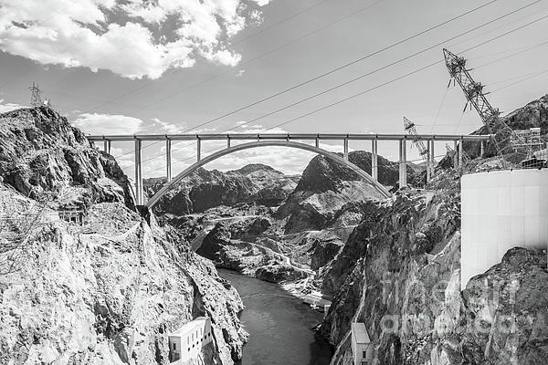 Hoover Dam Mike O'Callaghan–Pat Tillman Memorial Bridge black and white picture. Also known as the Hoover Dam Bypass Bridge, the arch bridge... more
