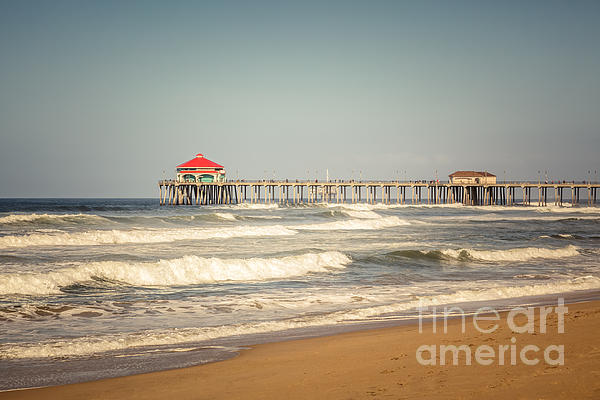 Huntington Beach Pier retro photo with 1960s tone. Huntington Beach Pier is a registered historic place and has a Ruby's Restaurant at the end. Huntington Beach is a seaside beach city along the Pacific Ocean in Orange County Southern California and is also known as Surf City USA. Image Copyright � Paul Velgos All Rights Reserved.