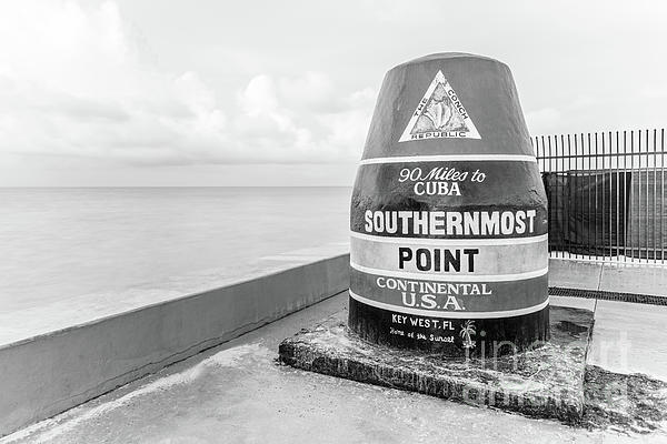 Key West Southernmost Point Buoy black and white photo. The famous Florida Keys Conch Republic attraction marks the southernmost point in the... more