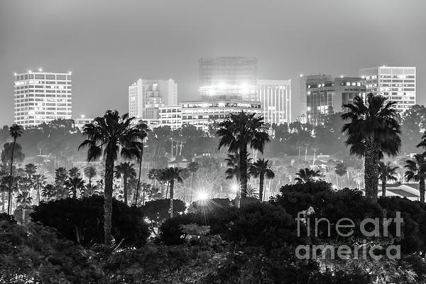 Newport Beach skyline at night black and white photo with office buildings and palm trees. Newport Beach is a coastal city in Orange County Southern... more