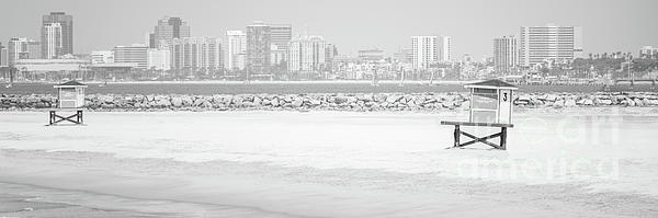 Seal Beach California black and white panorama photo with lifeguard towers three and five and the Long Beach skyline in the background. Seal Beach is a popular coastal city in Orange County Southern California in the United States of America. Copyright ⓒ 2015 Paul Velgos with All Rights Reserved.